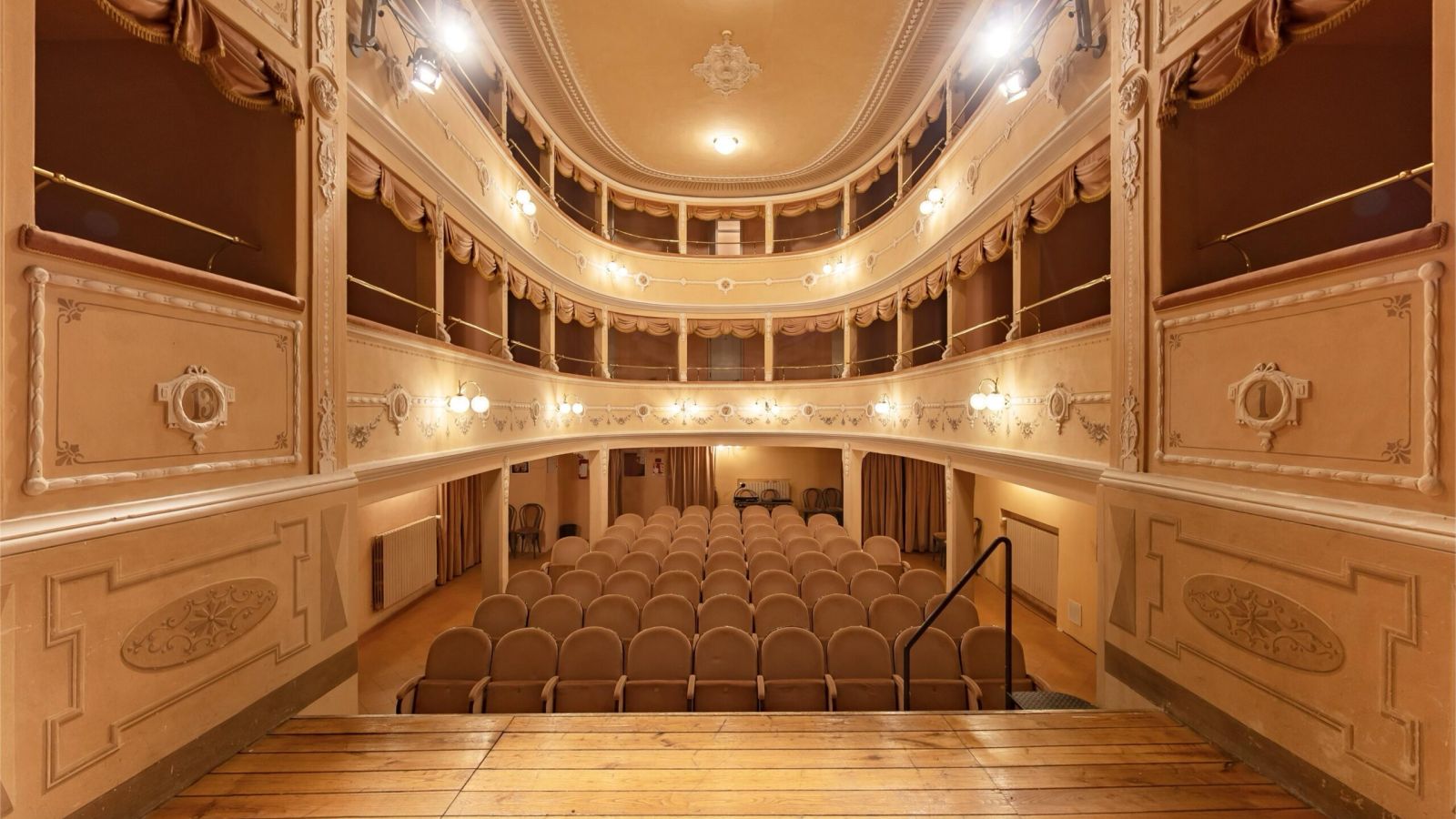Il teatro era ultimato l’anno seguente, anche perché all’inizio si era deciso di non costruire i palchi lasciando libera la “platea” coi sedili assegnati, lasciando l’uso della sala anche a conferenze pubbliche. Sul boccascena fu sistemata un’iscrizione “nec licet abolere vetustas” che suona pressappoco “non è lecito cancellare l’antichità”.